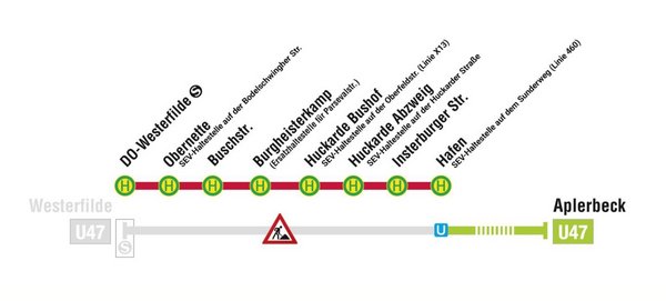 Vom 13. bis zum 26. März muss DSW21 die Stadtbahnlinie U47 unterbrechen. Zwischen den Haltestellen »Hauptfriedhof« und »Aplerbeck« fährt ein Schienenersatzverkehr mit Bussen. Dieser ist zu den Hauptverkehrszeiten im 10-Minuten-Takt, ansonsten im 15-Minuten-Takt unterwegs. Der Schienenersatzverkehr der U47 fährt Ersatzhaltestellen an, die sich in der Nähe der regulären Stadtbahn-Haltestellen befinden.