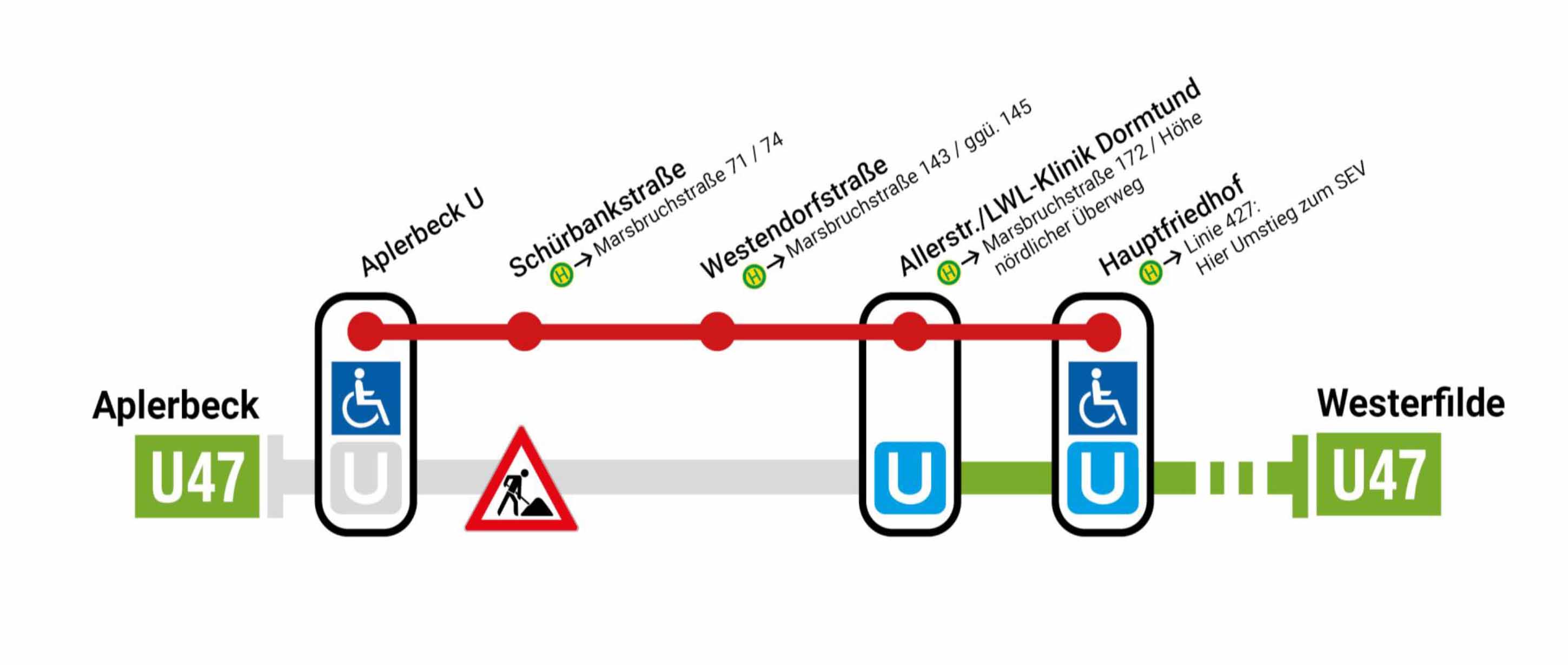 Ein barrierefreier Umstieg zwischen Schienenersatzverkehr und Stadtbahnlinie U47 ist an den Haltestellen »Aplerbeck« und »Hauptfriedhof« möglich. Für mobilitätseingeschränkte Fahrgäste, insbesondere solche mit einem elektrischen Rollstuhl, steht auf Anfrage ein Spezialfahrzeug bereit. Betroffene Fahrgäste können das Personal von DSW21 direkt ansprechen, um Unterstützung zu erhalten.