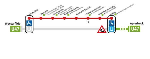Der SEV steuert Ersatzhaltestellen an, die sich in unmittelbarer Nähe der regulären Haltestelle befinden. Eine Ausnahme bildet die Haltestelle «Parsevalstraße«, die vorübergehend nicht angebunden wird. Dafür hält der SEV an der Bushaltestelle »Burgheisterkamp« (Linien 415, 461, 469, NE13). An der Haltestelle »Huckarde Abzweig« halten die Ersatzbusse indes nur in Fahrtrichtung Hafen bzw. Innenstadt.