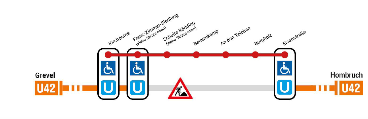 Im übrigen Streckenabschnitt der U42 (»Grotenbachstr.« – »Kirchderne«) fahren die Bahnen weiterhin regulär.