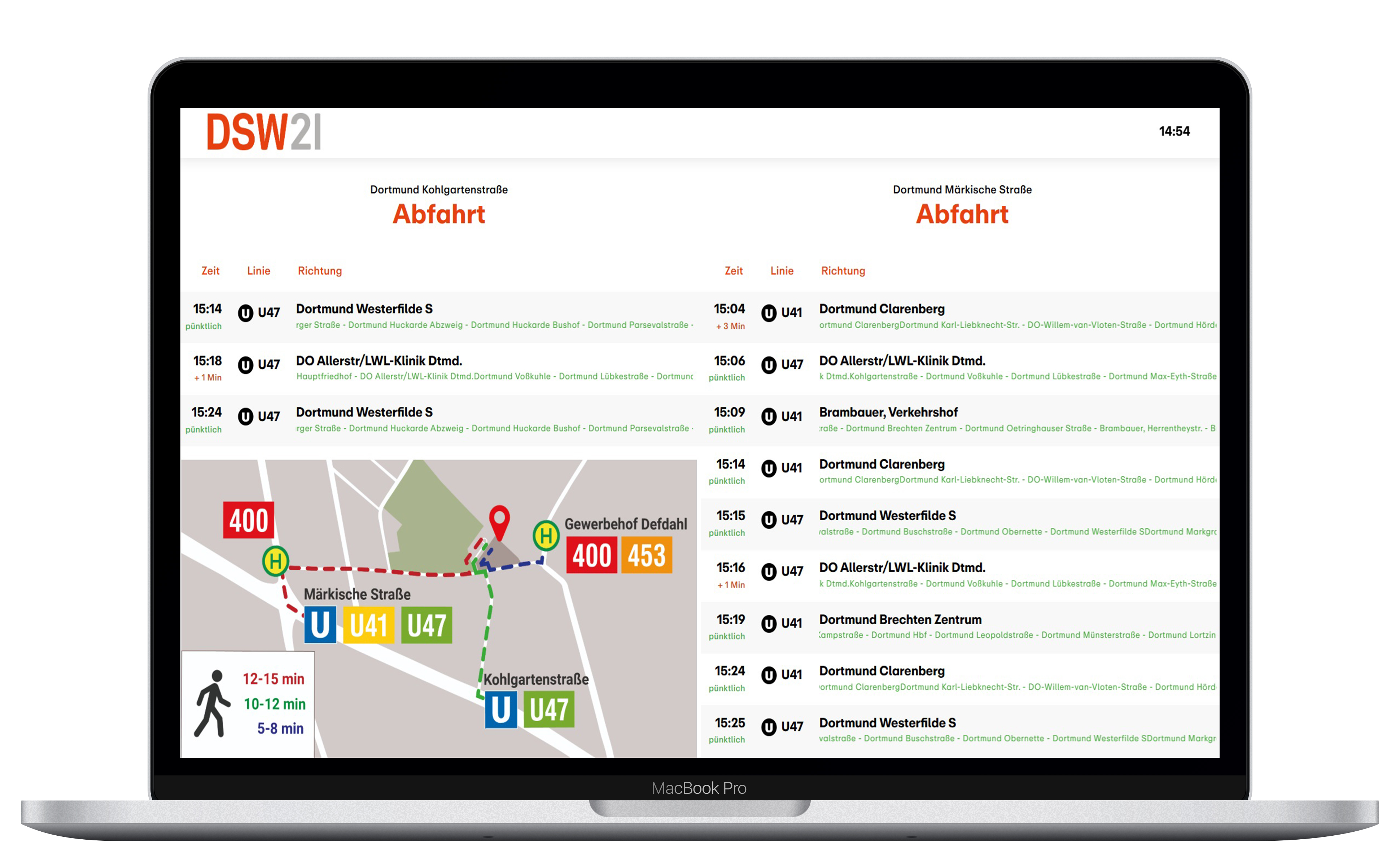 Mit Ihren Infos erstellen wir einen personalisierten Abfahrtsmonitor für Ihre nächstgelegene Haltestelle, der Echtzeitinformationen liefert und sich einfach auf digitalen Medien darstellen lässt. Beispiel Abfahrtsmonitor